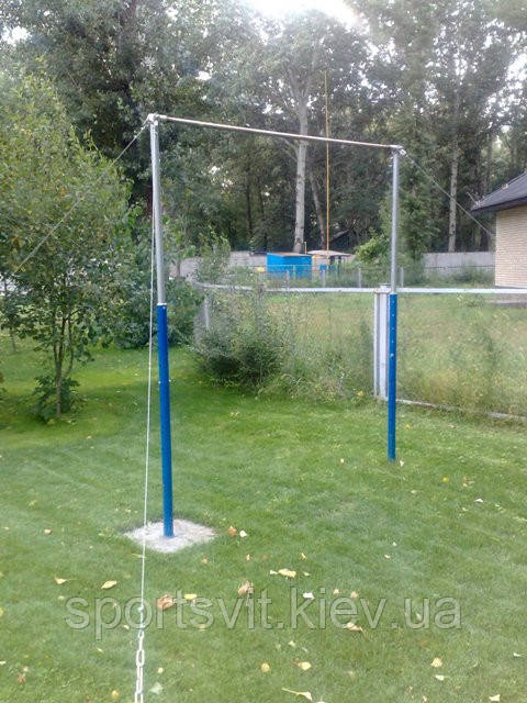 Стійки з труби Дн57 х 3,5 бетонуються в землю або вставляються в закладні, забетоновані в землі. У стійках зроблені отвори з кроком 1 м для закріплення опор (труба Ду32) з поперечиною (круг 30 ст.45) на різній висоті. Стійки зверху кріпляться розтяжками до 4 закладних, забетонованих у землі.